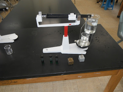 In light of the pre-assessment, I used the first part of Wednesday morning to cover graphing, coordinates, plotting, and the calculation of slope. I went over the pre-assessment. In the second part of the morning lecture I introduced density using metal cubes and an alphabet block. I calculated the density of each. I also used a beaker to calculate the density of water. Then I showed that objects with a density greater than that of water sank, while objects with a density less than the density of water float.